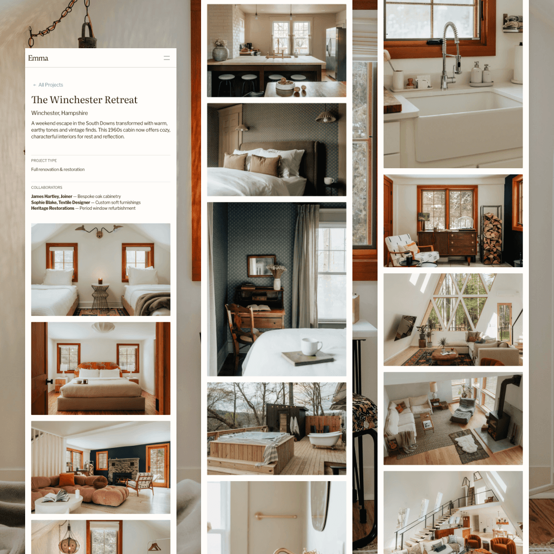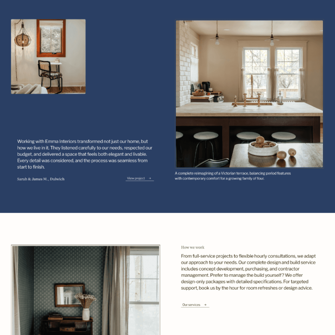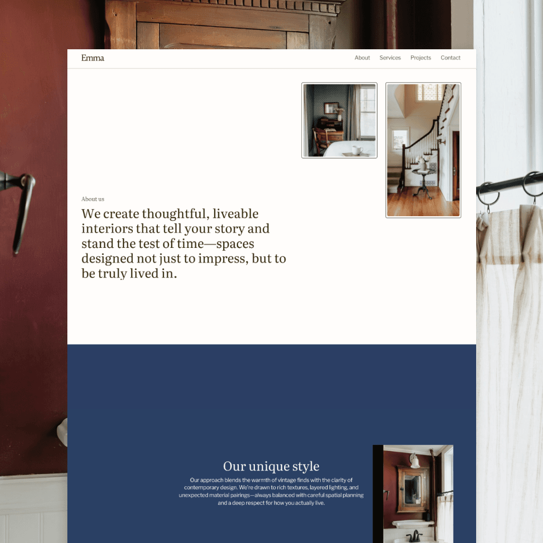 Emma Interiors is fully customisable to your brand's typography, colour palette, and imagery. Swap in your own projects, adjust layouts, and personalise copy to match your studio's voice—or launch as-is with this timeless design as the foundation for your online presence. Includes ready-to-use placeholder copy and project structure to get you online quickly.